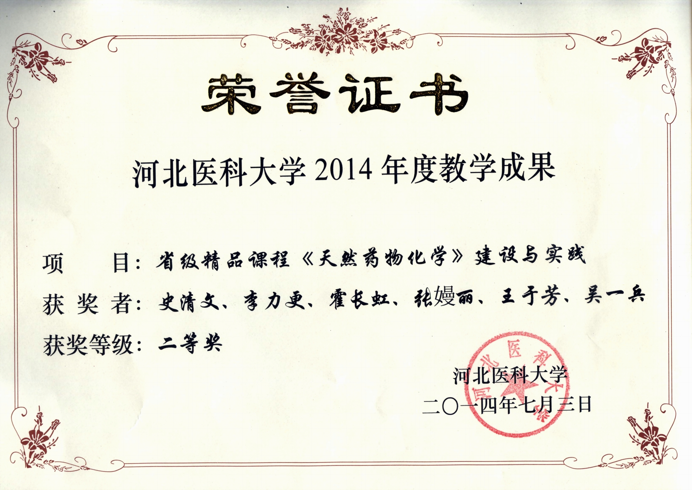 2014年度教学成果评审中,我室教学科研团队完成并上报的课题《省级精品课程天然药物化学建设与实践》荣获二等奖。