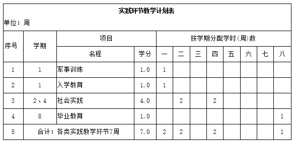 实践环节共4项,7学分。开设:军事训练、入学教育、社会实践、毕业教育等。