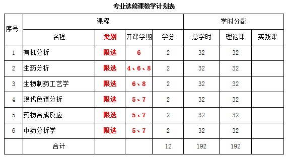 专业课共10门,840学时,41学分,开设:药剂学、中医药学基础、药事管理学、生物药物分析、药物化学、药物分析、天然药物化学、中药分析学、体内药物分析、食品安全性与分析检测。
