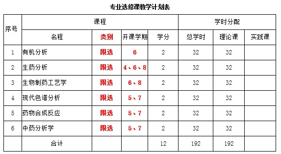 专业基础课共8门, 916学时,44.5学分,开设:药学导论、无机化学、有机化学、物理化学、分析化学、波谱解析、药学英语。