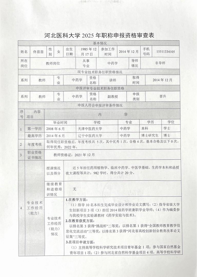 专业技术职务任职资格情况一览表-佟苗苗