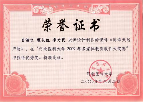 由我室教师史清文、霍长虹、李力更设计制作的教学课件《海洋天然产物》在探花系列 2009年多媒体教育教学软件大奖赛中获得优秀奖。