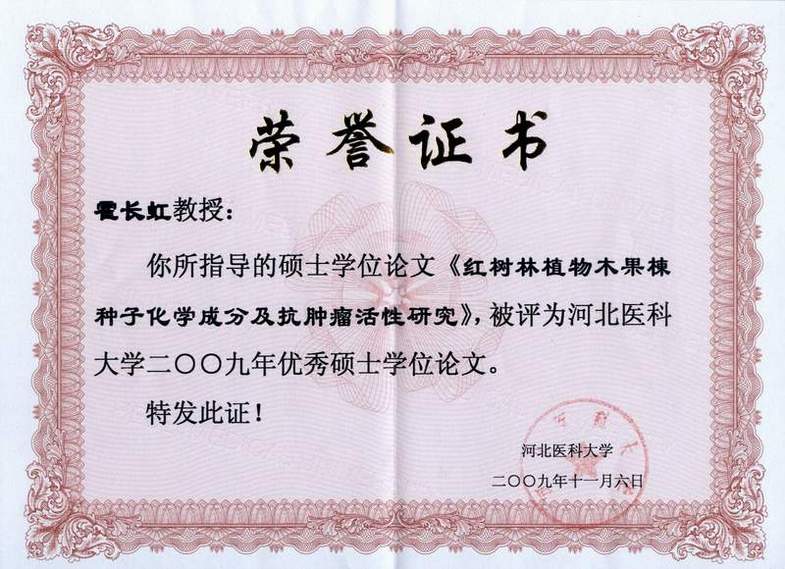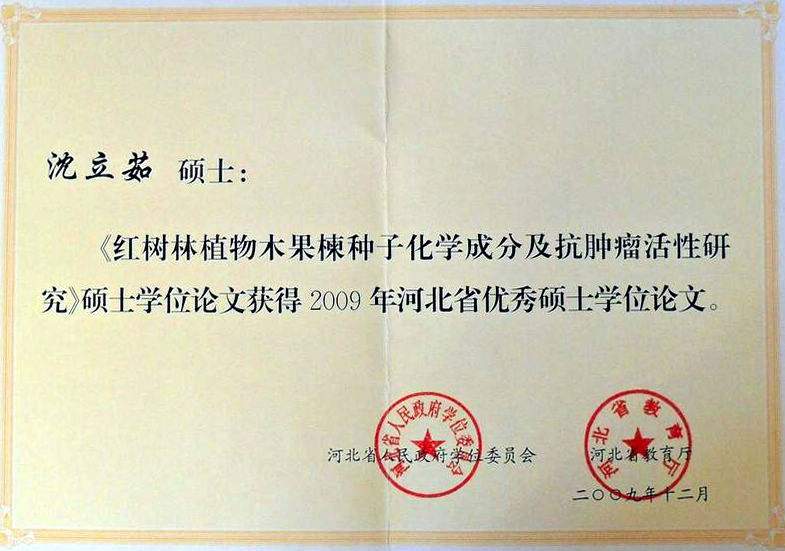 近日接我校研究生院通知:根据《河北省人民政府学位委员会关于做好河北省2009年优秀硕士学位论文评选工作的通知》,经专家组评议及公示,我室教师霍长虹副教授指导的05级硕士研究生沈立茹撰写的论文《红树林植物木果楝种子化学成分及抗肿瘤活性研究》被评为探花系列 2009年优秀硕士学位论文、2009年河北省优秀硕士学位论文。