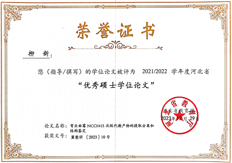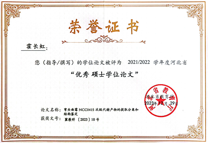 我室霍长虹教授指导的2019级硕士研究生柳新撰写的毕业论文《弯头曲霉NCC0415次级代谢产物的提取分离和结构鉴定》被评为2021-2022学年度河北省优秀硕士学位论文。